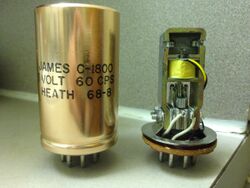 Since vibrators wore out over time, they were usually encased in a steel or aluminum "tin can" enclosure with a multi-pin plug at the bottom (similar to the contact pins on vacuum tubes), so they could be quickly unplugged and replaced without using tools.