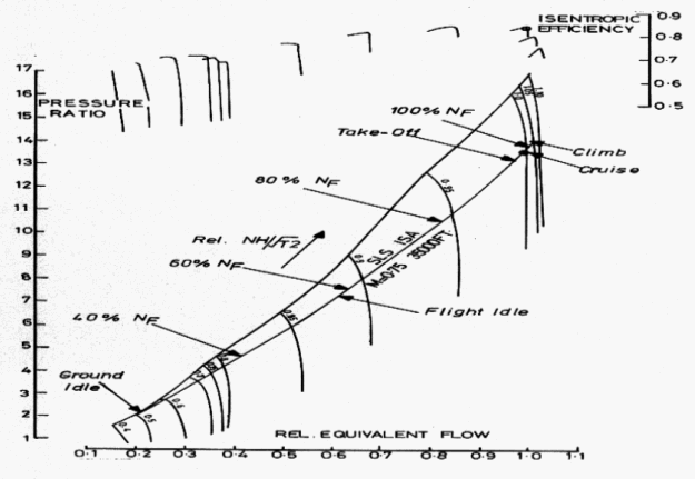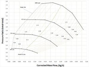 Compressors pump gas for a wide variety of applications each of which has its own flow resistance which the compressor has to meet to keep the gas flowing. A map shows the pumping characteristics for the complete range of flows and pressure requirements for its application. The map may be produced by driving the compressor with an electric motor with the flow resistance selected artificially using a variable area throttle valve. The compressor may also be mapped if it is part of a gas generator with a valve at the turbine exit. Campbell[10] shows a General Electric J79 compressor mapped in this way.