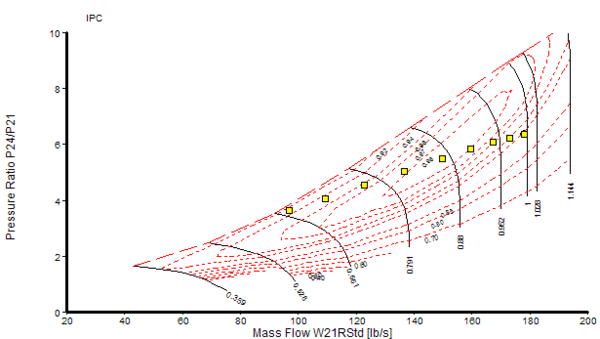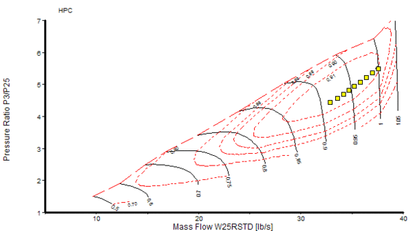 Note that the locus of peak efficiency exhibits a slight kink in its upward trend. This is due to the choking-up of the compressor as speed increases, with the variable stators closed-off. The trend line resumes once the variables start to move open.