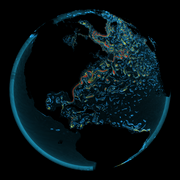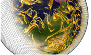 High quality volume rendering[15] of atmosphere simulation at global scale based on Geodesic grid. The colored strips indicate the simulated atmosphere vorticity strength based on GCRM model.[16]