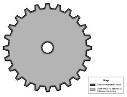 Diffusion hardening is a process used in manufacturing that increases the hardness of steels. In diffusion hardening, diffusion occurs between a steel with a low carbon content and a carbon-rich environment to increase the carbon content of the steel and ultimately harden the workpiece.[1][2] Diffusion only happens through a small thickness of a piece of steel (about 2.5 μm to 1.5 mm), so only the surface is hardened while the core maintains its original mechanical properties.[2] Heat treating may be performed on a diffusion hardened part to increase the hardness of the core as desired, but in most cases in which diffusion hardening is performed, it is desirable to have parts with a hard outer shell and a more ductile inside. Heat treating and quenching is a more efficient process if hardness is desired throughout the whole part. In the case of manufacturing parts subject to large amounts of wear, such as gears, the non-uniform properties acquired through diffusion hardening are desired. Through this process, gears obtain a hard wear-resistant outer shell but maintain their softer and more impact-resistant core.[2]