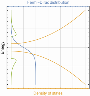 [math]\displaystyle{ \mu }[/math] is the chemical potential (also denoted as EF and called the Fermi level when T=0), [math]\displaystyle{ k_\mathrm{B} }[/math] is the Boltzmann constant, and [math]\displaystyle{ T }[/math] is temperature. Fig. 4 illustrates how the product of the Fermi-Dirac distribution function and the three-dimensional density of states for a semiconductor can give insight to physical properties such as carrier concentration and Energy band gaps.