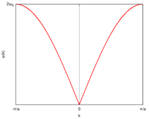 With the transformation [math]\displaystyle{ q = k - \pi/a }[/math] and small [math]\displaystyle{ q }[/math] this relation can be transformed to [math]\displaystyle{ E = 2 \hbar \omega_0 \left[1 - \left(\frac{qa}{2}\right)^2\right] }[/math]
