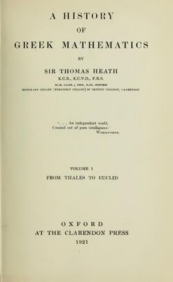 - ↑ Eves, Howard (January 1984). "A History of Greek Mathematics (2 vols.). By Sir Thomas Heath" (in en). The American Mathematical Monthly 91 (1): 62–64. doi:10.1080/00029890.1984.11971341. ISSN 0002-9890. https://doi.org/10.1080/00029890.1984.11971341. Retrieved 30 May 2023.