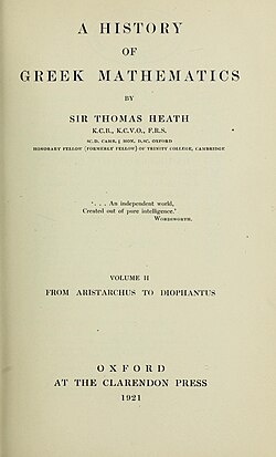 - ↑ "A History of Greek Mathematics. By Sir Thomas Heath. 2 Vols., pp. xv + 446, xi + 586. Oxford: The Clarendon Press, 1921. £2 10s." (in en). The Journal of Hellenic Studies 43 (1): 81–82. January 1923. doi:10.2307/625884. ISSN 2041-4099. https://doi.org/10.2307/625884. Retrieved 30 May 2023.