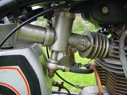 All Monoblocs were initially manufactured with the float chamber projecting on the left side of the body when viewed from the air intake. This led to fitment problems on twin carb installation. Amal introduced a "chopped" version of the 376 and 389 without the float chamber so twin carburettors could be fitted. Both carbs were fed from the float chamber of the left hand carb.[16] Triumph twins used two chopped monoblocs and a remote float chamber mounted centrally behind the carbs.[18][19] In 1964 a right hand version of the 389 was introduced, designated 689, which was a mirror image of the 389. This allowed twin carb installations with each carb having its own float chamber.[16]