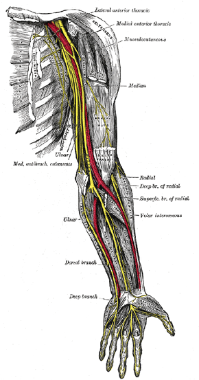 The nerve begins the process by destroying the nerve distal to the site of injury allowing Schwann cells, basal lamina, and the neurilemma near the injury to begin producing a regeneration tube. Nerve growth factors are produced causing many nerve sprouts to bud. When one of the growth processes finds the regeneration tube, it begins to grow rapidly towards its original destination guided the entire time by the regeneration tube. Nerve regeneration is very slow and can take up to several months to complete. While this process does repair some nerves, there will still be some functional deficit as the repairs are not perfect.[6]