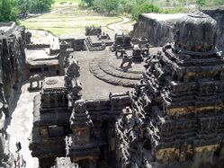 The Rashtrakutas contributed much to the architectural heritage of the Deccan. Art historian Adam Hardy categorizes their building activity into three schools: Ellora, around Badami, Aihole and Pattadakal, and at Sirval near Gulbarga.[168] The Rashtrakuta contributions to art and architecture are reflected in the splendid rock-cut cave temples at Ellora and Elephanta, areas also occupied by Jain monks, located in present-day Maharashtra. The Ellora site was originally part of a complex of 34 Buddhist caves probably created in the first half of the 6th century whose structural details show Pandyan influence. Cave temples occupied by Hindus are from later periods.[169]