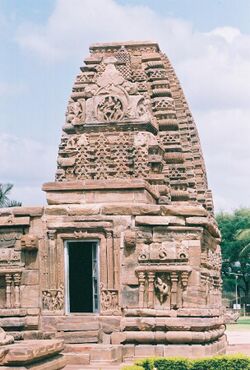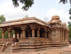 In Karnataka their most famous temples are the Kashivishvanatha temple and the Jain Narayana temple at Pattadakal, a UNESCO World Heritage site.[178][179] Other well-known temples are the Parameshwara temple at Konnur, Brahmadeva temple at Savadi, the Settavva, Kontigudi II, Jadaragudi and Ambigeragudi temples at Aihole, Mallikarjuna temple at Ron, Andhakeshwara temple at Huli (Hooli), Someshwara temple at Sogal, Jain temples at Lokapura, Navalinga temple at Kuknur, Kumaraswamy temple at Sandur, numerous temples at Shirival in Gulbarga,[180] and the Trikuteshwara temple at Gadag which was later expanded by Kalyani Chalukyas. Archeological study of these temples show some have the stellar (multigonal) plan later to be used profusely by the Hoysalas at Belur and Halebidu.[181] One of the richest traditions in Indian architecture took shape in the Deccan during this time which Adam Hardy calls Karnata dravida style as opposed to traditional Dravida style.[182]