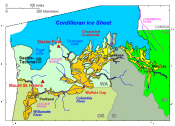 The Missoula Floods (also known as the Spokane Floods or the Bretz Floods) refer to the cataclysmic floods that swept periodically across eastern Washington (state) and down the Columbia River Gorge at the end of the last ice age. The glacial flood events have been researched since the 1920s. These glacial lake outburst floods were the result of periodic sudden ruptures of the ice dam on the Clark Fork River that created Glacial Lake Missoula. After each ice dam rupture, the waters of the lake would rush down the Clark Fork and the Columbia River, flooding much of eastern Washington and the Willamette Valley in western Oregon. After the rupture, the ice would reform, creating Glacial Lake Missoula again.