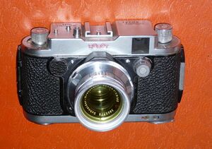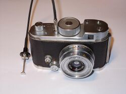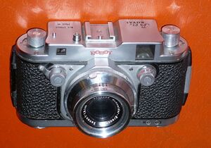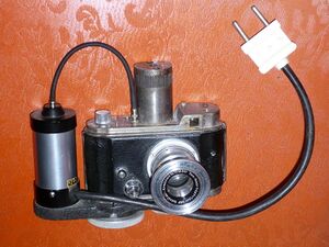 Robot Royal III has a main spring, when tightened, the camera can take 4 to 5 pictures in succession. It has a built in rangefinder, eight interchangeable bayonet mount lenses.