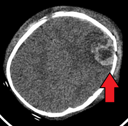 The above CT scan shows an infant having suffered a severe skull fracture and intercranial bleeding from head trauma caused by abusive parenting.