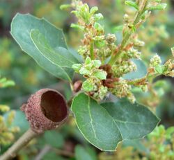 Though limited to three islands, it is not uncommon there, occurring in grassland, chaparral, oak woodlands, forest, and other habitat. It is the dominant oak in many areas on Catalina Island.[5] It was described as a new species in 1994 from a specimen collected on Santa Cruz Island.[6] More than a century earlier, the same plant was described as a variety of Quercus dumosa;[7] the 1994 name is nevertheless the correct name for the plant when recognized as a species because names hold priority status only within a given rank.[8]