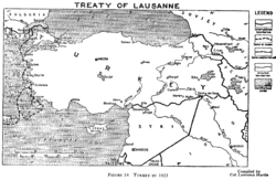 After World War I and the Turkish War of Independence, the Ottoman Empire was disbanded and the modern Republic of Turkey was created, and Alexandretta was not part of the new republic, it was put within the French mandate of Syria after a signed agreement between the Allies and Turkey, the Treaty of Sèvres, which was neither ratified by the Ottoman parliament nor by the Turkish National Movement in Ankara.[8] The subsequent Treaty of Lausanne also put Alexandretta within Syria. The document detailing the boundary between Turkey and Syria around 1920 and subsequent years is presented in a report by the Official Geographer of The Bureau of Intelligence and Research of the US Department of State.[9] A French-Turkish treaty of 20 October 1921 rendered the Sanjak of Alexandretta autonomous, and it remained so from 1921 to 1923. Out of 220,000 inhabitants in 1921, 87,000 were Turks.[10] Along with Turks the population of the Sanjak included: Arabs of various religious denominations (Sunni Muslims, Alawites, Greek Orthodox, Greek Catholics, Maronites); Jews; Syriacs; Kurds; and Armenians. In 1923 Hatay was attached to the State of Aleppo, and in 1925 it was directly attached to the French mandate of Syria, still with special administrative status.