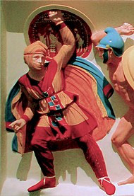 The Immortals were described by Herodotus as being heavy infantry, led by Hydarnes II, that were kept constantly at a strength of exactly 10,000 men. He claimed that the unit's name stemmed from the custom that every killed, seriously wounded, or sick member was immediately replaced with a new one, maintaining the numbers and cohesion of the unit.[183] They had wicker shields, short spears, swords or large daggers, and bow and arrows. Underneath their robes they wore scale armour coats. The spear counterbalances of the common soldiery were of silver; to differentiate commanding ranks, the officers' spear butt-spikes were golden.[183] Surviving Achaemenid colored glazed bricks and carved reliefs represent the Immortals as wearing elaborate robes, hoop earrings and gold jewellery, though these garments and accessories were most likely worn only for ceremonial occasions.[184]