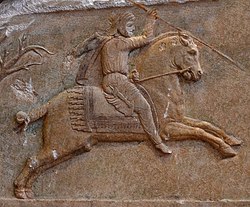 When the power in Ecbatana changed hands from the Medes to the Persians, many tributaries to the Median Empire believed their situation had changed and revolted against Cyrus.[42] This forced Cyrus to fight wars against Bactria and the nomadic Saka in Central Asia.[43] During these wars, Cyrus established several garrison towns in Central Asia, including the Cyropolis.[44]