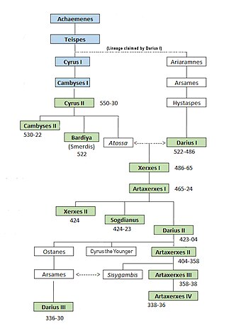 bar:Rulers color:era from:-675 till:-640 text: Teispes from:-640 till:-600 text: Cyrus I from:-600 till:-559 text: Cambyses I from:-559 till:-530 shift:(0,5) text: Cyrus II from:-530 till:-522 shift:(0,-9) text: Cambyses II from:-522 till:-522 shift:(0,-17) text: Smerdis from:-522 till:-486 shift:(0,-33) text: Darius I from:-486 till:-465 text: Xerxes I from:-465 till:-424 shift:(0,-10) text: Artaxerxes I from:-424 till:-424 shift:(0,-3) text: Xerxes II from:-424 till:-424 shift:(0,-25) text:Sogdianus from:-424 till:-404 shift:(-20,14) text: Darius II from:-404 till:-358 shift:(-10,4) text: Artaxerxes II from:-358 till:-338 shift:(0,-8) text: Artaxerxes III from:-338 till:-336 shift:(-20,21) text: Arses from:-336 till:-330 shift:(-10,11) text: Darius III from:-330 till:-329 shift:(0,-15) text: Bessus