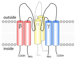 ENaC consists of three different subunits: α, β, γ.[2][15] All three subunits are essential for transport to the membrane assembly of functional channels on the membrane.[16] The C-terminus of each ENaC subunit contains a PPXY motif which when mutated or deleted in either the β- or γ-ENaC subunit leads to Liddle's syndrome, a human autosomal dominant form of hypertension. The cryoEM structure of ENaC indicates that the channel is a heterotrimeric protein like the acid-sensing ion channel 1 (ASIC1), which belongs to the same family.[17][18] Each of the subunits consists of two transmembrane helices and an extracellular loop. The amino- and carboxy-termini of all three polypeptides are located in the cytosol.