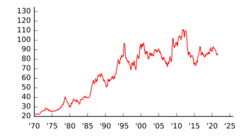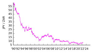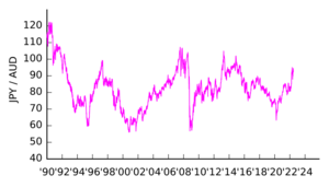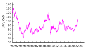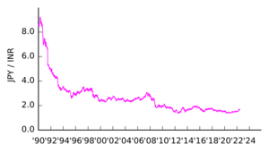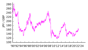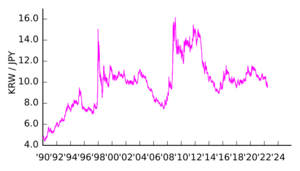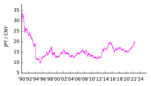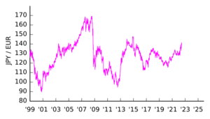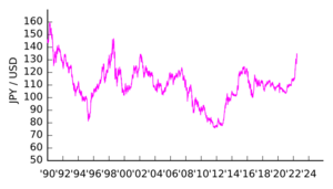 Since that time, however, the world price of the yen has greatly decreased, falling to an average of almost ¥150 per dollar in November 2023 (before recovering a little).[5] The Bank of Japan maintains a policy of zero to near-zero interest rates and the Japanese government has previously had a strict anti-inflation policy.[6] From late 2021 to late 2023, the yen depreciated against the dollar by about 40%,[7][5] giving rise to serious concern in Japan about long-term prospects for the currency.[8][9][10] However, this weakness has had some benefits for Japan's tourism industry, as the low exchange rate makes its purchasing power attractive for travellers, particularly those from foreign nations.[11][12]