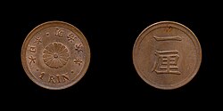 Bronze coins worth one-one thousandth of a yen called "Rin" were first introduced in 1873. One rin coins were very small measuring 15.75 mm in diameter, and co-circulated with mon coins of the old currency system. Their small size eventually was their undoing as the rin was abandoned in 1884 due to unpopularity. Five rin coins worth one-two hundredth of a yen also used a bronze alloy. These were successor coins to the equally valued half sen coin which had been previously minted until 1888. The decision to bring back an equally valued coin was in response to rising inflation caused by World War I which led to an overall shortage of subsidiary coins. The mintage period for five rin coins was brief as they were discontinued after only four years of production due to their sharp decline in monetary value. The overall demand for subsidiary coinage ended as Japan slipped into a post-war recession. Coins worth 1 and 5 rin were eventually officially taken out of circulation at the end of 1953 and demonetized.