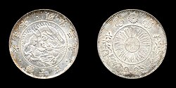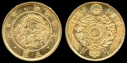 The first gold yen coins consisted of 2, 5, and 20 yen coins which were struck throughout 1870. Five yen coins were first struck in gold for the Japanese government in 1870 at the San Francisco Mint.[36] During this time a new mint was being established at Osaka , which did not receive the gold bullion needed for coinage until the following year.[37] Gold bullion was delivered from private Japanese citizens, foreigners, and the Japanese government.[38] Initially the government opted for silver, which would become the standard unit of value leaving gold coinage as a subsidiary.[39] While gold coinage couldn't be produced domestically in 1870, the mint at Osaka could produce silver coins which included denominations of 5, 10, 20, and 50 sen.[40][41] None of these coins dated "1870" circulated until the Meiji government officially adopted the "yen" as Japan's modern unit of currency on June 27, 1871.[42] This Act formally stipulated the adoption of the decimal accounting system of yen (1, 圓), sen (1⁄100, 錢), and rin (1⁄1000, 厘). The new currency was gradually introduced beginning from July of that year.