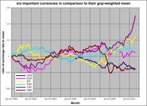 Since 1973, the Japanese government has maintained a policy of currency intervention, so the yen is under a "dirty float" regime. The Japanese government focused on a competitive export market, and tried to ensure a low exchange rate for the yen through a trade surplus. The Plaza Accord of 1985 temporarily changed this situation; the exchange rate fell from its average of ¥239 per dollar in 1985 to ¥128 in 1988 and led to a peak rate of ¥80 against the US$ in 1995, effectively increasing the value of Japan's GDP in dollar terms to almost that of the United States.[4]