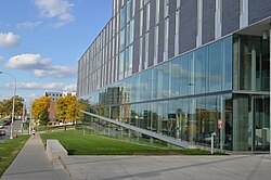 Syracuse is classified among "R1: Doctoral Universities – Very High Research Activity".[12] According to the National Science Foundation, Syracuse spent $154.3 million on research and development in FY 2019, ranking it 136th in the nation.[164][165] Through the university's Office of Research, which promotes research, technology transfer, and scholarship, and its Office of Sponsored Programs, which assists faculty in seeking and obtaining external research support, SU supports research in the fields of management and business, sciences, engineering, education, information studies, energy, environment, communications, computer science, public and international affairs, and other specialized areas.[166] Syracuse became a member of the Association of American Universities (AAU) in 1966, an organization of leading research universities devoted to maintaining a strong system of research and education.[167] In 2011, however, the university's board of trustees voted to pull out of the research consortium due to dispute over the counting of non-Federal research dollars.[168]