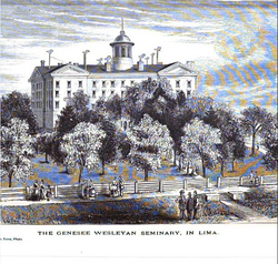 The institution's roots can be traced to the Genesee Wesleyan Seminary. The seminary was founded in 1831 by the Genesee annual conference of the Methodist Episcopal Church in Lima, New York, south of Rochester.[17] In 1850, it was resolved to enlarge the institution from a seminary into a college, or to connect a college with the seminary, becoming Genesee College. However, the location was soon thought by many to be insufficiently central. Its difficulties were compounded by a new railroad that competed with the Erie Canal and reconfigured the region's primary economic conduits to bypass Lima. The trustees of the struggling college decided to seek an alternate locale whose economic and transportation advantages could provide a surer base of support.