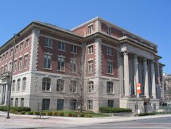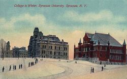 The university was founded as coeducational and racially integrated: "open to men and women, white and black."[33] President Peck stated at the opening ceremonies, "The conditions of admission shall be equal to all persons... there shall be no invidious discrimination here against woman.... brains and heart shall have a fair chance... "[37] Syracuse implemented this policy with a high proportion of women students for its era. In the College of Liberal Arts, the ratio between male and female students during the 19th century was approximately even. The College of Fine Arts was predominantly female, while lower ratios of women enrolled in the College of Medicine and the College of Law.[37] Men and women were taught together in the same courses, and many extra-curricular activities were coeducational as well. Syracuse also developed "women-only" organizations and clubs.[37]