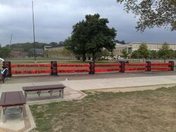 In the early days of Carnegie Tech, there was a single bridge connecting Margaret Morrison Women's College with the Carnegie Institute of Technology. The bridge was a meeting place for students. In 1916, the bridge was taken down and the university filled in the area. The administration built a wooden fence as a new meeting place. The students did not understand why anyone would want to meet at a fence. The administration was about to give up and tear it down, but that night a fraternity, as a prank, painted the entire fence advertising a fraternity party. Ever since, painting the Fence has been a Carnegie Mellon tradition.[154] The Fence at Carnegie Mellon lies at the center of campus, in the area known as "the Cut". Students guard the fence 24 hours a day, and, as long as two vigils are maintained, no other student may "take" the fence. The fence can then be painted by the group that has it, but only between midnight and 6 am. Only hand brushes may be used; the use of spray paint or paint rollers is considered vandalism and results in a fine. The previous paint cannot be stripped, and each new painting adds a new layer. The original wooden fence finally collapsed in the 1990s due to the weight from over 1' of surrounding paint, and was immediately replaced with an identical one manufactured from concrete. Today the fence is considered "the world's most painted object". by the Guinness Book of World Records.[155]