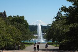 Organizers of the 1909 Alaska–Yukon–Pacific Exposition eyed the still largely undeveloped campus as a prime setting for their world's fair. They came to an agreement with Washington's Board of Regents that allowed them to use the campus grounds for the exposition, surrounding today's Drumheller Fountain facing towards Mount Rainier. In exchange, organizers agreed Washington would take over the campus and its development after the fair's conclusion. This arrangement led to a detailed site plan and several new buildings, prepared in part by John Charles Olmsted. The plan was later incorporated into the overall UW campus master plan, permanently affecting the campus layout.