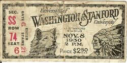 The university participates in the National Collegiate Athletic Association's Division I FBS. It is a member of the Pac-12 Conference through the 2023–24 academic year, after which it will join the Big Ten Conference.[152] The football team is traditionally competitive, having won the 1960 and 1991 national title and appeared in the College Football Playoff in 2016 and 2023, to go along with seven Rose Bowl victories and single wins in the Orange Bowl and Sugar Bowl. From 1907 to 1917, Washington football teams were unbeaten in 64 consecutive games, an NCAA record.[153] Tailgating by boat has been a Husky Stadium tradition since 1920 when the stadium was first built on the shores of Lake Washington. The Apple Cup game is an annual game against cross-state rival Washington State University that was first contested in 1900 with UW leading the all-time series, 75 wins to 33 losses and 6 ties. This game was last won by the University of Washington, and the Apple Cup trophy currently resides in Seattle. College Football Hall of Fame member Don James is a former head coach.