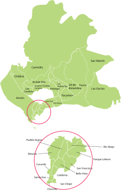 The city is located in Panama District, although its metropolitan area also includes some populated areas on the opposite side of the Panama Canal. As in the rest of the country, the city is divided into corregimientos, in which there are many smaller boroughs. The old quarter, known as the Casco Viejo, is located in the corregimiento of San Felipe. San Felipe and twelve other corregimientos form the urban center of the city, including Santa Ana, El Chorrillo, Calidonia, Curundú, Ancón, Bella Vista, Bethania, San Francisco, Juan Diaz, Pueblo Nuevo, Parque Lefevre, and Río Abajo.