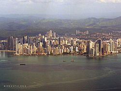 Panama City (Spanish: Ciudad de Panamá; pronounced [sjuˈða(ð) ðe panaˈma]), also known as Panama (or Panamá in Spanish), is the capital and largest city of Panama.[4][5] It has a total population of 1,938,000,[1] with over 1,500,000 in its urban area. The city is located at the Pacific entrance of the Panama Canal, in the province of Panama. The city is the political and administrative center of the country, as well as a hub for banking and commerce.[6]