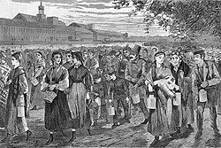 Working conditions in the mills were unsafe and in 1860 the Pemberton Mill collapsed, killing 145 workers.[10] As immigrants flooded into the United States in the mid to late 19th century, the population of Lawrence abounded with skilled and unskilled workers from several countries. Protesting conditions, in 1912 they walked out of the mills. The action, sometimes celebrated as the Bread and Roses Strike, was one of the more important, widely reported, labor struggles in American history.[11]