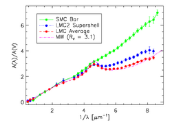 In the LMC, there is significant variation in the characteristics of the ultraviolet extinction with a weaker 2175 Å bump and stronger far-UV extinction in the region associated with the LMC2 supershell (near the 30 Doradus starbursting region) than seen elsewhere in the LMC and in the Milky Way.[30][31] In the SMC, more extreme variation is seen with no 2175 Å bump and very strong far-UV extinction in the star forming Bar and fairly normal ultraviolet extinction seen in the more quiescent Wing.[32][33][34]