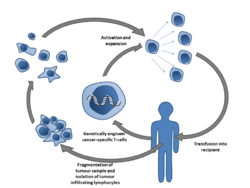 Multiple ways of producing and obtaining tumour targeted T-cells have been developed. T-cells specific to a tumor antigen can be removed from a tumor sample (TILs) or filtered from blood. Subsequent activation and culturing is performed ex vivo, with the results reinfused. Activation can take place through gene therapy, or by exposing the T cells to tumor antigens.