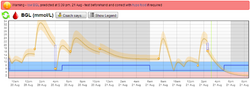 The Standard day data plots, see example 2, shows that trends are easy to see. The blood glucose readings are plotted at their level versus the time of day. Multiple days are plotted on top of each other, creating a scatter of points. In the example shown, it is easy to see the glycemic excursions to high blood sugars following breakfast and lunch. Once identified, this can be improved by using a faster acting insulin, or injecting insulin 20 minutes before eating, or by selecting carbohydrates to eat that are slower to peak in the bloodstream.