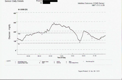 Example 8 shows a data plot from a continuous glucose prediction system (CGPS). This plot shows the blood sugar levels between meals and also during the night, when other BG testing methods using a finger prick sample would typically miss the data available between samples. CGPS is a new technology that it intended to give immediate feedback between finger sticks and also predict what may be happening soon to give the person with diabetes a chance to correct a high or low blood sugar condition before it becomes urgent.