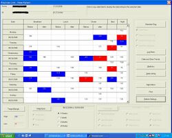 Example 1 shows a logbook can combine readings from multiple meters (such as one at home and another at work or school) in one place. Breakfast, lunch, and dinner readings are lined up vertically to help look for trends. The logbook automatically colors the box red for a low blood sugar, and blue for a high blood sugar. In the example chart, a pattern is easy to visualize: mornings tend to be a bit high (more insulin is needed at night) and there is a pattern of lows occurring after dinner (perhaps dinner insulin or the afternoon basal rates could be turned down).