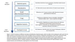 Bacterial endospores are most resistant to disinfectants, but some fungi, viruses and bacteria also possess some resistance.[12]