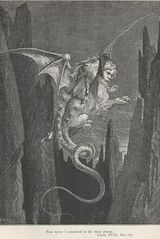 Geryon, the winged monster who allows Dante and Virgil to descend a vast cliff to reach the Eighth Circle, was traditionally represented as a giant with three heads and three conjoined bodies.[72] Dante's Geryon, meanwhile, is an image of fraud,[73] combining human, bestial, and reptilian elements: Geryon is a "monster with the general shape of a wyvern but with the tail of a scorpion, hairy arms, a gaudily-marked reptilian body, and the face of a just and honest man".[74] The pleasant human face on this grotesque body evokes the insincere fraudster whose intentions "behind the face" are all monstrous, cold-blooded, and stinging with poison.
