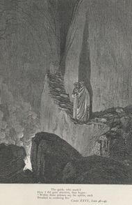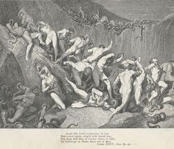 Relating this sin of incontinence to the two that preceded it (lust and gluttony), Dorothy L. Sayers writes, "Mutual indulgence has already declined into selfish appetite; now, that appetite becomes aware of the incompatible and equally selfish appetites of other people. Indifference becomes mutual antagonism, imaged here by the antagonism between hoarding and squandering."[48] The contrast between these two groups leads Virgil to discourse on the nature of Fortune, who raises nations to greatness and later plunges them into poverty, as she shifts, "those empty goods from nation unto nation, clan to clan".[49] This speech fills what would otherwise be a gap in the poem, since both groups are so absorbed in their activity that Virgil tells Dante that it would be pointless to try to speak to them – indeed, they have lost their individuality and been rendered "unrecognizable".[50]