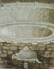 Dante now finds himself in the Eighth Circle, called Malebolge ("Evil ditches"): the upper half of the Hell of the Fraudulent and Malicious. The Eighth Circle is a large funnel of stone shaped like an amphitheatre around which run a series of ten deep, narrow, concentric ditches or trenches called bolge (singular: bolgia). Within these ditches are punished those guilty of Simple Fraud. From the foot of the Great Cliff to the Well (which forms the neck of the funnel) are large spurs of rock, like umbrella ribs or spokes, which serve as bridges over the ten ditches. Dorothy L. Sayers writes that the Malebolge is, "the image of the City in corruption: the progressive disintegration of every social relationship, personal and public. Sexuality, ecclesiastical and civil office, language, ownership, counsel, authority, psychic influence, and material interdependence – all the media of the community's interchange are perverted and falsified".[75]
