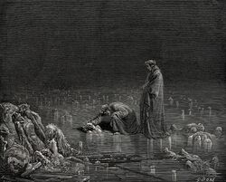 At the base of the well, Dante finds himself within a large frozen lake: Cocytus, the Ninth Circle of Hell. Trapped in the ice, each according to his guilt, are punished sinners guilty of treachery against those with whom they had special relationships. The lake of ice is divided into four concentric rings (or "rounds") of traitors corresponding, in order of seriousness, to betrayal of family ties, betrayal of community ties, betrayal of guests, and betrayal of lords. This is in contrast to the popular image of Hell as fiery; as Ciardi writes, "The treacheries of these souls were denials of love (which is God) and of all human warmth. Only the remorseless dead center of the ice will serve to express their natures. As they denied God's love, so are they furthest removed from the light and warmth of His Sun. As they denied all human ties, so are they bound only by the unyielding ice."[99] This final, deepest level of hell is reserved for traitors, betrayers and oathbreakers (its most famous inmate is Judas Iscariot).