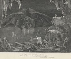 Dorothy L. Sayers notes that Satan's three faces are thought by some to suggest his control over the three human races: red for the Europeans (from Japheth), yellow for the Asiatic (from Shem), and black for the African (the race of Ham).[106] All interpretations recognize that the three faces represent a fundamental perversion of the Trinity: Satan is impotent, ignorant, and full of hate, in contrast to the all-powerful, all-knowing, and all-loving nature of God.[106] Lucifer retains his six wings (he originally belonged to the angelic order of Seraphim, described in Isaiah 6:2), but these are now dark, bat-like, and futile: the icy wind that emanates from the beating of Lucifer's wings only further ensures his own imprisonment in the frozen lake. He weeps from his six eyes, and his tears mix with bloody froth and pus as they pour down his three chins. Each face has a mouth that chews eternally on a prominent traitor. Marcus Junius Brutus and Gaius Cassius Longinus dangle with their feet in the left and right mouths, respectively, for their involvement in the assassination of Julius Caesar (March 15, 44 BC) – an act which, to Dante, represented the destruction of a unified Italy and the killing of the man who was divinely appointed to govern the world.[106] In the central, most vicious mouth is Judas Iscariot, the apostle who betrayed Christ. Judas is receiving the most horrifying torture of the three traitors: his head is gnawed inside Lucifer's mouth while his back is forever flayed and shredded by Lucifer's claws. According to Dorothy L. Sayers, "just as Judas figures treason against God, so Brutus and Cassius figure treason against Man-in-Society; or we may say that we have here the images of treason against the Divine and the Secular government of the world".[106]