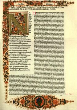 The poem begins on the night of Maundy Thursday on March 24 (or April 7), AD 1300, shortly before dawn of Good Friday.[3][4] The narrator, Dante himself, is thirty-five years old, and thus "midway in the journey of our life" (Nel mezzo del cammin di nostra vita[5]) – half of the Biblical lifespan of seventy (Psalm 89:10, Vulgate; Psalm 90:10, KJV). The poet finds himself lost in a dark wood (selva oscura[6]), astray from the "straight way" (diritta via,[7] also translatable as "right way") of salvation. He sets out to climb directly up a small mountain, but his way is blocked by three beasts he cannot evade: a lonza[8] (usually rendered as "leopard" or "leopon"),[9] a leone[10] (lion), and a lupa[11] (she-wolf). The three beasts, taken from Jeremiah 5:6, are thought to symbolize the three kinds of sin that bring the unrepentant soul into one of the three major divisions of Hell. According to John Ciardi, these are incontinence (the she-wolf); violence and bestiality (the lion); and fraud and malice (the leopard);[12] Dorothy L. Sayers assigns the leopard to incontinence and the she-wolf to fraud/malice.[13] It is now dawn of Good Friday, April 8, with the sun rising in Aries. The beasts drive him back despairing into the darkness of error, a "lower place" (basso loco[14]) where the sun is silent (l sol tace[15]). However, Dante is rescued by a figure who announces that he was born sub Iulio[16] (i.e. in the time of Julius Caesar) and lived under Augustus: it is the shade of the Roman poet Virgil, author of the Aeneid, a Latin epic.