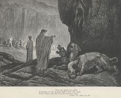 In the third circle, the gluttonous wallow in a vile, putrid slush produced by a ceaseless, foul, icy rain – "a great storm of putrefaction"[41] – as punishment for subjecting their reason to a voracious appetite. Cerberus (described as "il gran vermo", literally "the great worm", line 22), the monstrous three-headed beast of Hell, ravenously guards the gluttons lying in the freezing mire, mauling and flaying them with his claws as they howl like dogs. Virgil obtains safe passage past the monster by filling its three mouths with mud.