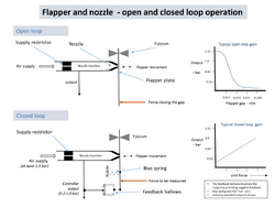 The example shown is pneumatic. At sub-millimeter distances, a small movement of the flapper plate results in a large change in flow. The nozzle is fed from a chamber which is in turn fed by a restriction, so changes of flow result in changes of chamber pressure. The nozzle diameter must be larger than the restriction orifice in order to work.[2] The high gain of the open loop mechanism can be made linear using a pressure feedback bellows on the flapper to create a force balance system with a linear output. The "live" zero of 0.2 bar or 3 psi is set by the bias spring which ensures that the device is working in its linear region.