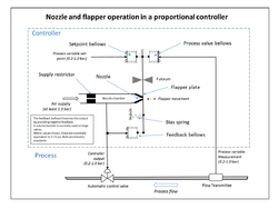 From Handwiki The nozzle and flapper mechanism is a displacement type detector which converts mechanical movement into a pressure signal by covering the opening of a nozzle with a flat plate called the flapper.[1] This restricts fluid flow through the nozzle and generates a pressure signal. It is a widely used mechanical means of creating a high gain fluid amplifier. In industrial control systems, they played an important part in the development of pneumatic PID controllers and are still widely used today in pneumatic and hydraulic control and instrumentation systems.